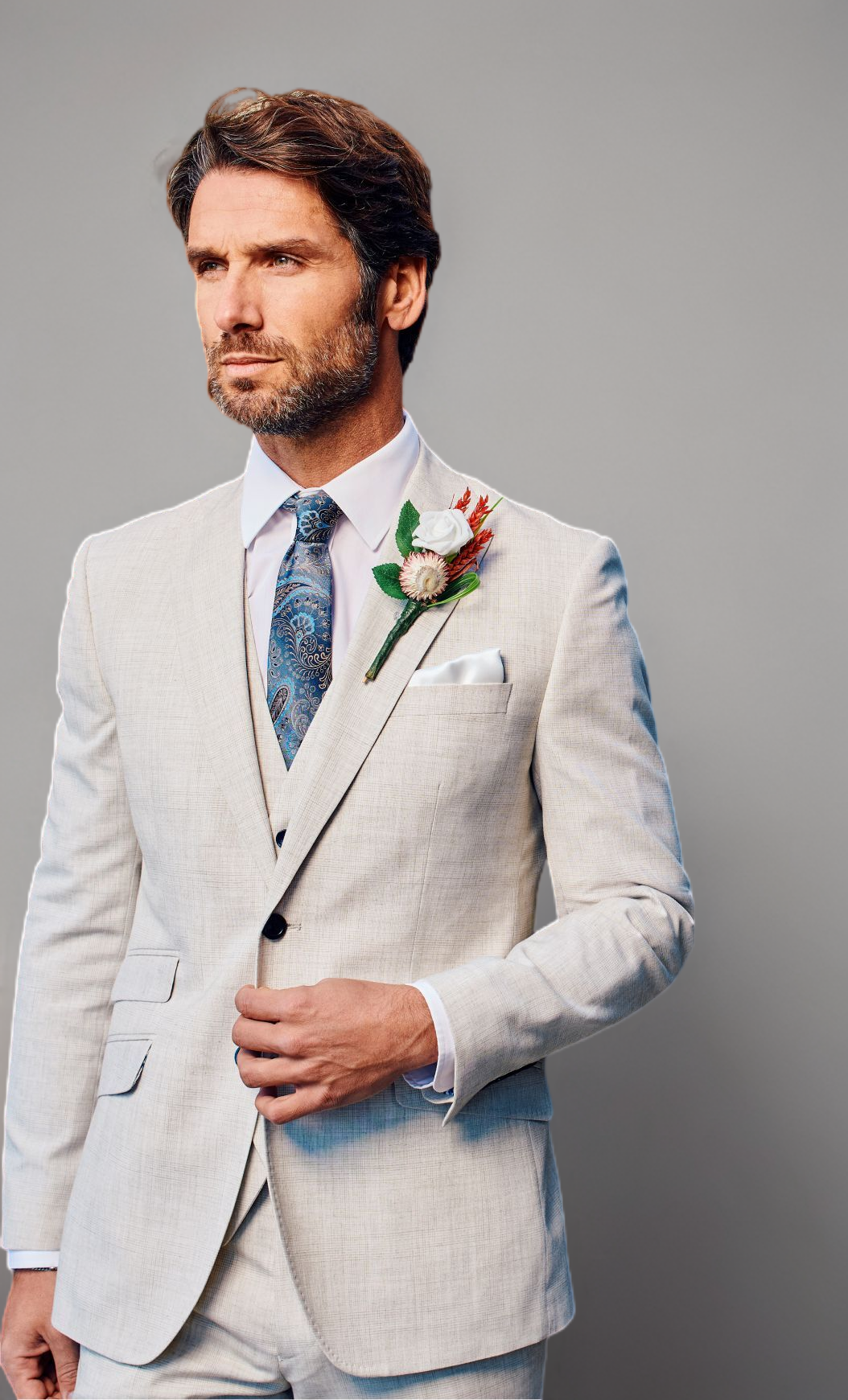 - Stay effortlessly stylish in our three-piece beige suit, perfect for summer occasions.